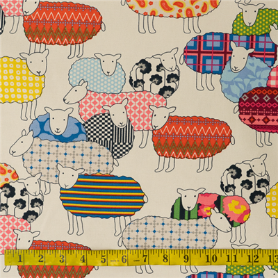 Light weight canvas, printed single side, white background with coloured sheep design.