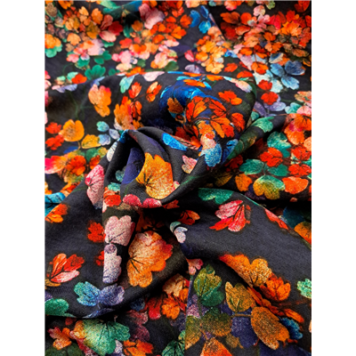 Bright leafy and floral print on a navy background