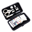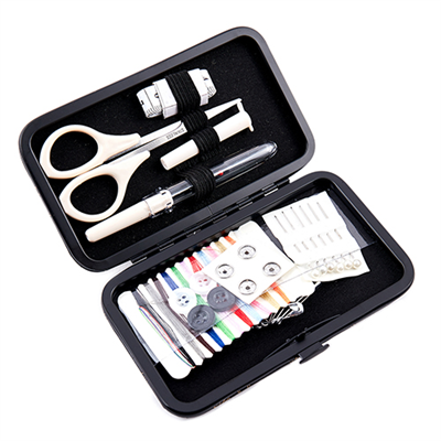 Kit includes: 9cm scissors, fibreglass tape measure 64cm, 12 coloured polyester threads, needle threader, seam ripper, 4 shirt buttons, 4 snap fasteners, 3 hand needles, 6 safety pins, 6 plastic head pins.