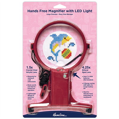 Hands Free Magnifier with LED Lamp. This lightweight hands free magnifier with lamp offers a bright lamp to illuminate your handiwork, this magnifier is perfect for delicate hand embroidery and heirloom sewing.