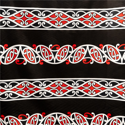 Red and white Maori print on black background