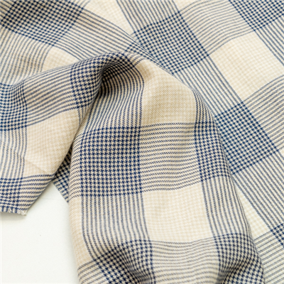 Woven taupe and French blue check on a off white background