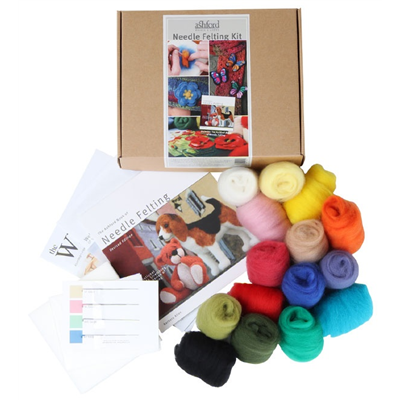 Kit includes 4 types of needle, 15 colours of fibre, foam block, washaway fabric and The Ashford Book of Needle Felting by Barbara Allen.