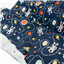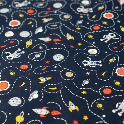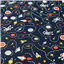 Printed stretch drill, navy background with space theme.