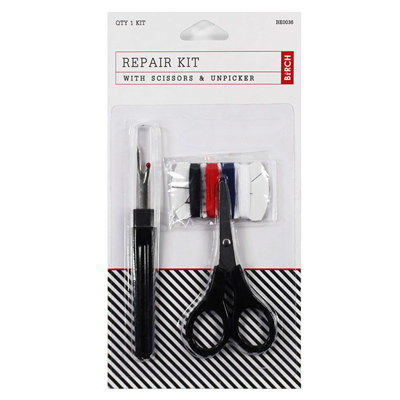 Repair Kit - with scissors and unpicker. Contains: thread, needles, scissors and unpicker.