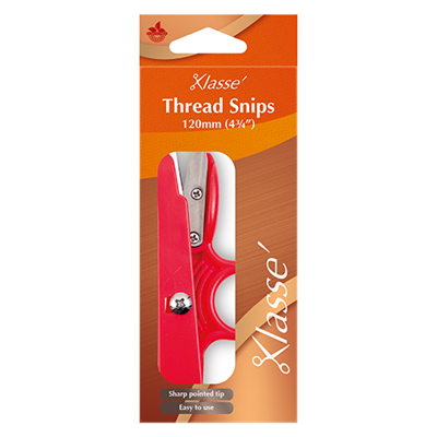 Thread Snips. Squeezing action for quick trimming of threads. Extra sharp stainless steel blades. Pointed precision tip and a finger hole for easy grip.