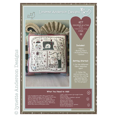 This kit includes:- a colour pattern, all the fabrics to make the One Stitch at a Time pillow including the pre-printed stitchery background.