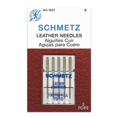 The SCHMETZ Leather sewing machine needle has a left twist cutting point. As the name suggests, use the Leather needle to sew leather, faux leather, paper, and heavy non-woven synthetics. The cutting point easily penetrates leather. Remember once the stitch is created, the thread can be removed, but the stitch hole will remain. Do not use on knit or woven fabrics.